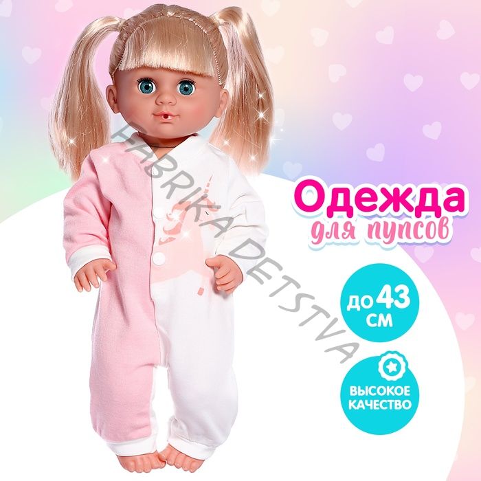 Маленькие леди переодевают любимых пупсиков несколько раз в день. Ведь для разных жизненных ситуаций пупсу нужен соответствующий дресс-код. Особенности костюма Подходит для пупсов ростом 43 см. Фиксируется клёпками. Рекомендуем стирать вручную, утюжить при минимальном нагреве, не отбеливать и не сушить в машинке. Играем с пользой Обновляя комплект своему пупсу, девочка осваивает социальные роли и модели поведения взрослых, тренирует фантазию и эстетический вкус.