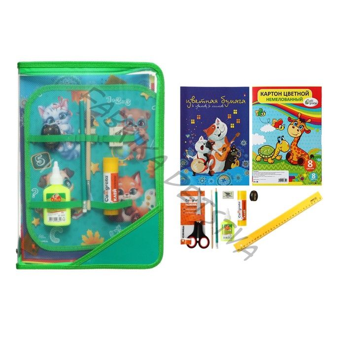 Папка для труда А4, 325x230x25 мм, молния вокруг, откидная планка, пластиковая, ПТР-1 «Зверята», с наполнением 10 предметов