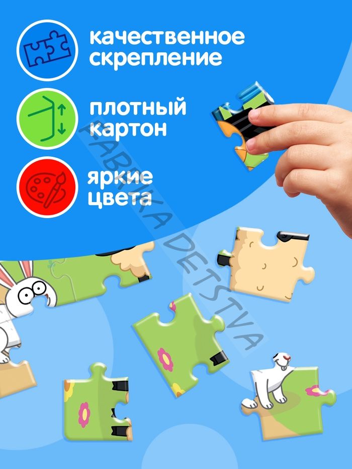 Пазл «На ферме» из серии «Синий трактор» станет отличным выбором для детей, которые любят мультфильмы и увлекательные головоломки. Этот набор из 24 элементов поможет ребёнку развить мелкую моторику, внимание и логическое мышление, одновременно погружая его в мир ярких образов и любимых персонажей. Особенности Классический пазл прямоугольной формы с изображением любимого персонажа. Изготовлен из плотного картона, что обеспечивает долговечность и безопасность. Польза собирания пазлов для детей: Развивает логическое мышление и кратковременную память. Тренирует усидчивость и мелкую моторику рук. Учит различать цвета и находить связь между частью и целым. Как сохранить собранный пазл Возьмите клейкую ленту и зафиксируйте её на обратной стороне пазла: сначала в вертикальном, потом в горизонтальном направлениях. Тщательно придавливайте каждую полоску клейкой ленты к пазлу. Аккуратно обрежьте оставшиеся края клейкой ленты. Готово! Вставьте получившуюся картинку в раму и украсьте интерьер. Сборка пазла — это не только увлекательное занятие, но и эффективный способ развить у ребёнка усидчивость и пространственное мышление. Яркие иллюстрации с персонажами мультфильма «Синий трактор» делают процесс ещё более интересным, а удобный размер элементов идеально подходит для маленьких ручек. Этот пазл станет отличным подарком для малышей, которые только начинают знакомиться с головоломками. Он подходит для семейного досуга и помогает укрепить связь между родителями и детьми через совместную игру.