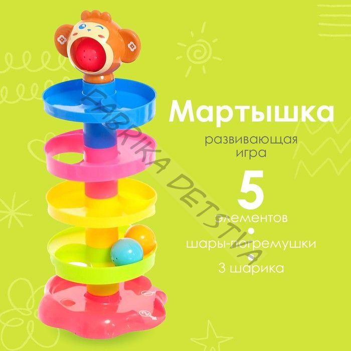 Пирамидка «Мартышка» разовьёт логическое мышление, воображение, слуховое, визуальное восприятие и мелкую моторику. Яркие шарики привлекут внимание малыша, он с удовольствием будет скатывать их по спирали и слушать забавные звуки.