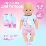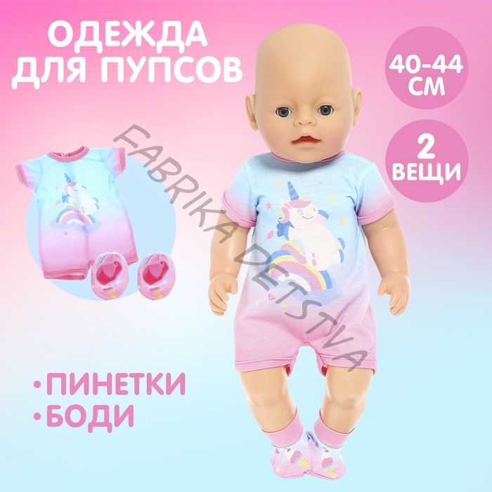 Добавьте в гардероб любимой куклы вашей малышки стильную одежду! Ведь для разных жизненных ситуаций пупсу нужен соответствующий образ. Подробнее о комплекте В набор входит боди и пинетки. Комплект с красочным принтом и гармоничным сочетанием цветов. Подходит для кукол ростом 40–44 см. Боди фиксируется липучками сзади, поэтому выглядит аккуратно и хорошо сидит на пупсике. А ещё с такими застёжками малышка сможет быстро переодеть куклу. Одежда выполнена из приятной на ощупь ткани. Пополняйте гардероб стильными вещами — в серии представлена и другая одежда для кукол. Играть в куклы — полезно Подбирая одежду пупсу и наряжая его, девочка улучшает сообразительность, тренирует фантазию, эстетический вкус и мелкую моторику, а также учится одеваться по погоде.