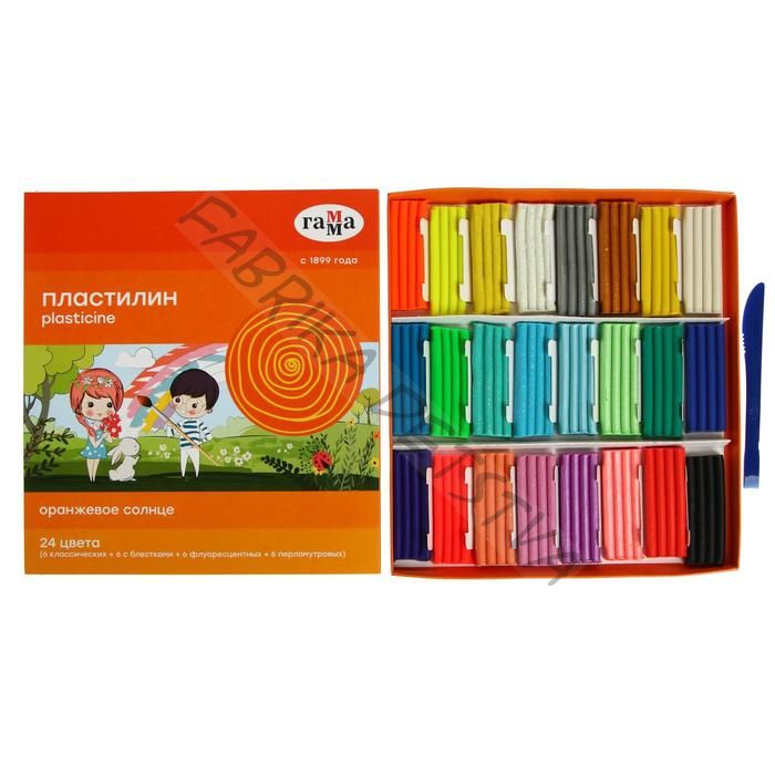 Пластилин 24 цвета 312 г (6 классических, 6 с блёстками, 6 перламутровых, 6 флуоресцентных) «Гамма» «Оранжевое солнце», со стеком