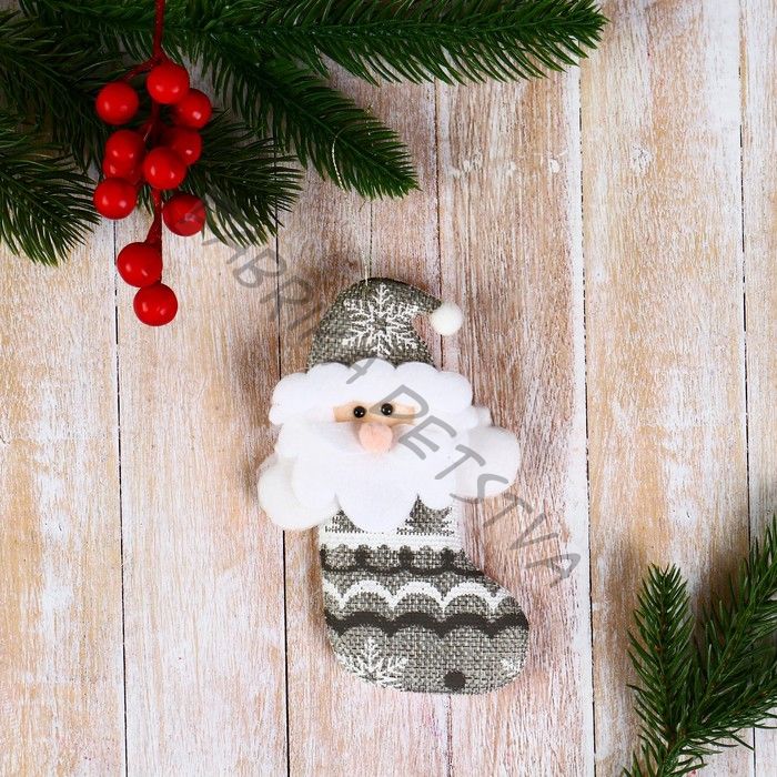 Подвеска мягкая на ёлку «Дед Мороз в костюмчике с орнаментом лес в носке» 7x13 см, серая