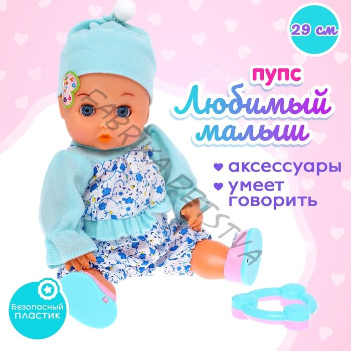 Ваша принцесса любит играть в дочки-матери? Тогда от этого набора с пупсом и аксессуарами она будет в восторге! «Любимый малыш» — это не только кукла, за которой нужно ухаживать, но и прекрасный компаньон для больших воображаемых и реальных приключений. Подробнее о наборе Высота пупса — 29 см. Тело куклы из пластика, голова резиновая. Ручки и ножки подвижные, что позволяет придавать естественные позы и делает игру более реалистичной. Глаза закрываются. Одежда легко снимается, поэтому ребёнок сможет менять образы и почувствует себя настоящим стилистом! Также в набор входит аксессуар — игрушка (звуков не издаёт) для пупса. Размер игрушки — 6,5 см. С ней игра станет ещё увлекательнее! Пупс издаёт звуки: смех, плач, говорит «мама» и «папа». Работает от 3 батареек типоразмера LR44 (входят в комплект). Играть в куклы — полезно Взаимодействуя с куклами, девочка развивает креативность и эстетический вкус, а также тренирует сообразительность, фантазию и мелкую моторику. Ребёнок осваивает социальные роли, проецирует модели поведения взрослых на игровые сюжеты, учится заботе и ответственности.