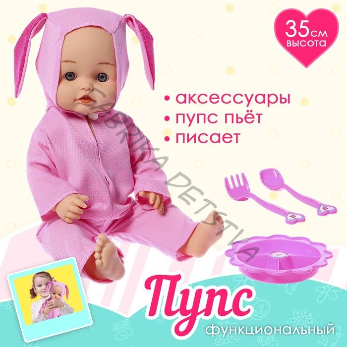 Функциональный пупс высотой 35 см станет отличным спутником для игр и фантазий. Игрушка способна пить и писать, что помогает детям развить навыки заботы и ответственности. Пупс изготовлен из пластика и текстиля, что делает его легким и приятным на ощупь. Одежда и обувь съемные, что позволяет разнообразить игровые сценарии. Особенности Подвижные руки в плечах и ноги в бёдрах обеспечивают интерактивность игры Умеет пить из бутылочки и писать на горшок Глазки закрываются, что добавляет реалистичности Пупс одет в стильный наряд, который порадует маленьких модниц Кукла изготовлена из качественных материалов: пластикового корпуса и текстильных элементов одежды Комплектация Тарелочка Ложка Вилка Комбинезон без выбора цвета Пупс станет отличным подарком на день рождения или любой другой праздник для детей. Благодаря функциональности и реалистичным деталям, игрушка будет интересна и полезна любому малышу.