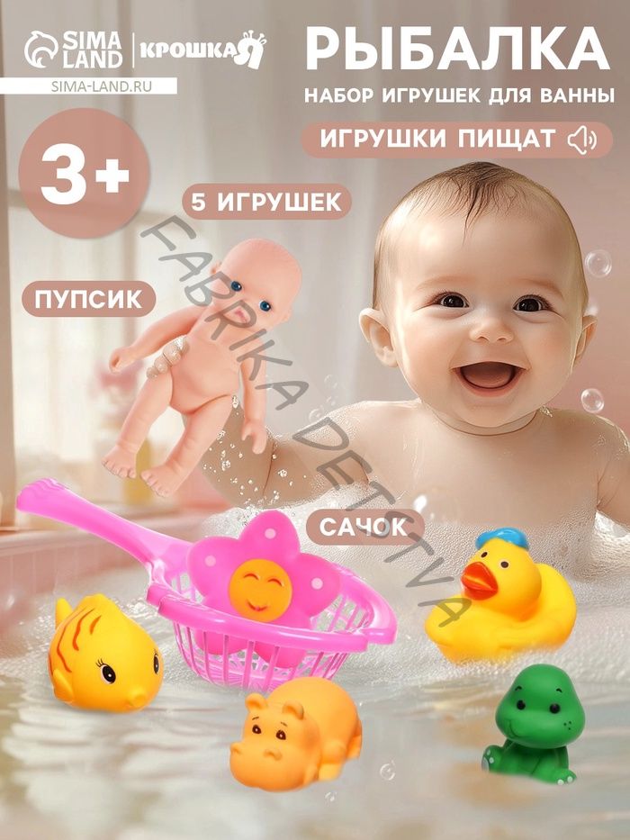 Резиновые игрушки для ванны Крошка Я «Игры с пупсиком», сачок, в наборе 7 шт.