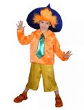 широкополая шляпа, галстук, оранжевая рубаха и жёлтые штаны.
