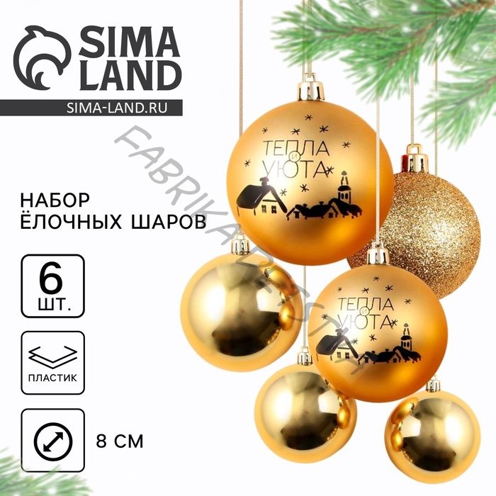 Шары ёлочные новогодние «Тепла и уюта!», пластик, d=8, 6 шт., золотые