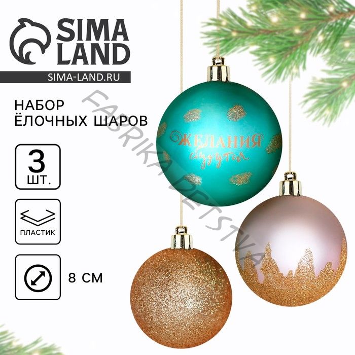 Шары ёлочные новогодние «Желания сбудутся!», на Новый год, пластик, d=8, 3 шт., розовые, тиффани, золотые