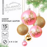 Шары ёлочные новогодние, d=3 и d=6, 15 шт., розовые, золотые