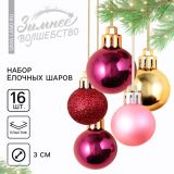 Шары ёлочные новогодние, пластик, d=3 см, набор 16 шт., винные, розовый и золотой