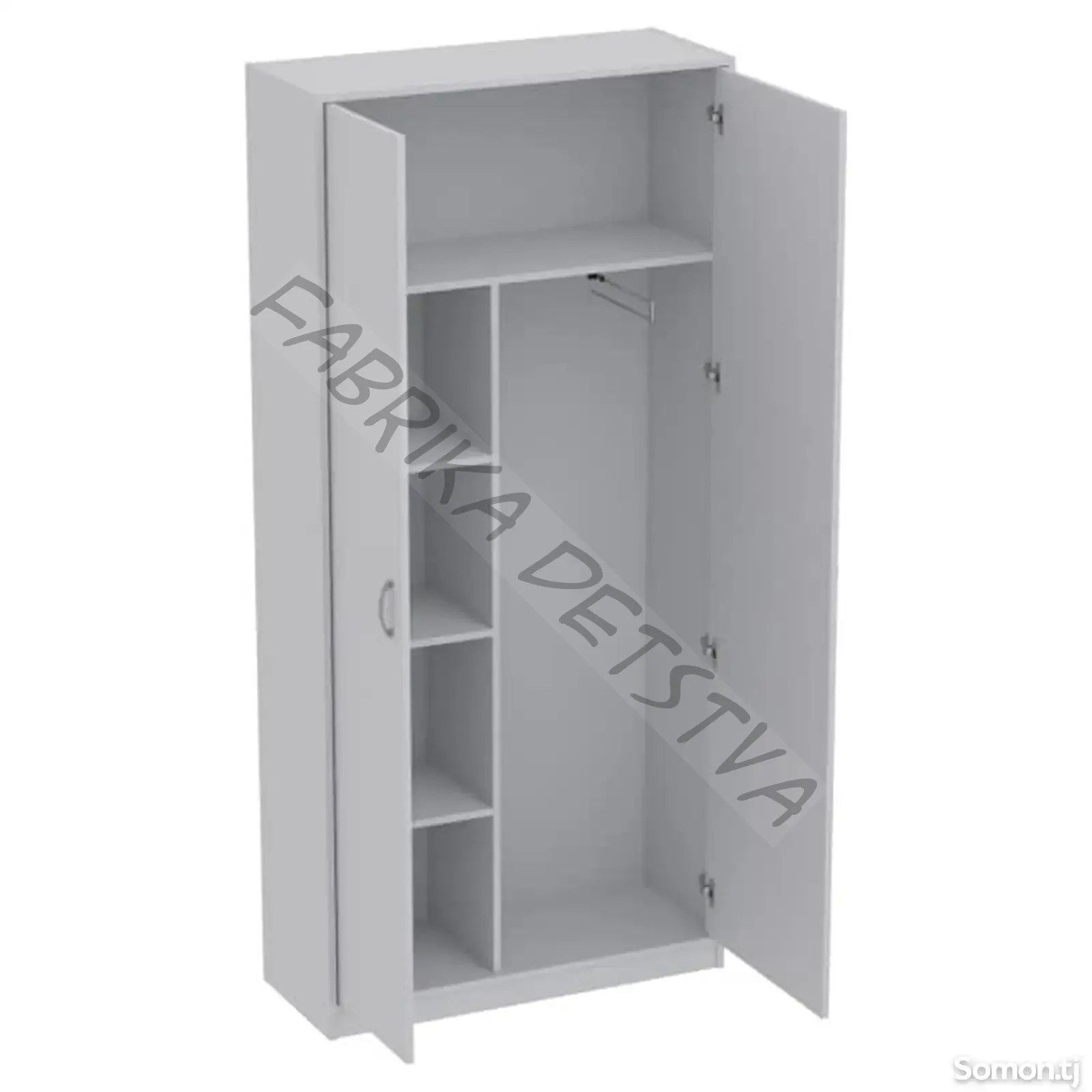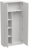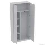 Толщина листа ДСП 16 мм, 2 глухие распашные дверцы, шкаф имеет три отделения: одно отделение с 4 полками , второе отделение для одежды с выдвижной штангой, третье для головных уборов. Шкаф снабжен регулируемыми опорами.