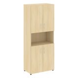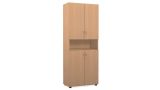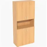 Шкаф изготовлен из ЛДСП толщиной 16 мм, отделан кантом ПВХ 0,4 мм. Внешний габарит 854х375х1820 мм. Задняя стенка изготовлена из ламинированного МДФ, толщиной 3,2 мм, в цвет ДСП из двух частей, которые соединяются между собой с помощью специального армированного скотча. Четыре двери попарно закрывают нижний и верхний отсеки. Между отсеками образуется ниша высотой 43 см. Комплектуется четырьмя полками: две врезных и две вкладных. Регулируемые опоры компенсируют неровности пола.