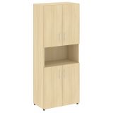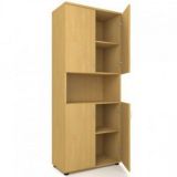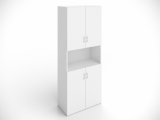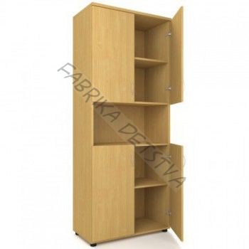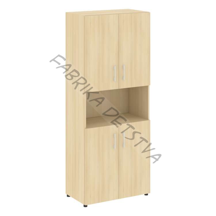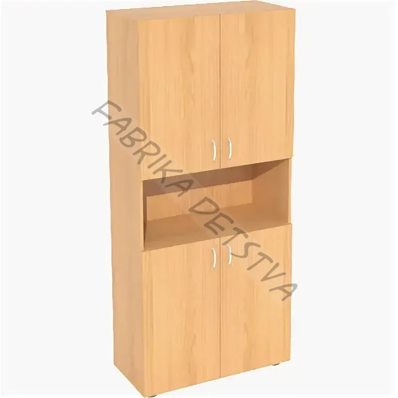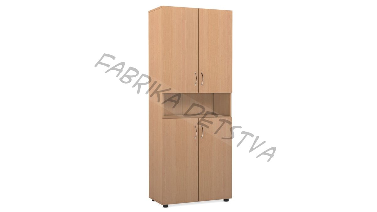Шкаф изготовлен из ЛДСП толщиной 16 мм, отделан кантом ПВХ 0,4 мм. Внешний габарит 854х375х1820 мм. Задняя стенка изготовлена из ламинированного МДФ, толщиной 3,2 мм, в цвет ДСП из двух частей, которые соединяются между собой с помощью специального армированного скотча. Четыре двери попарно закрывают нижний и верхний отсеки. Между отсеками образуется ниша высотой 43 см. Комплектуется четырьмя полками: две врезных и две вкладных. Регулируемые опоры компенсируют неровности пола.