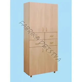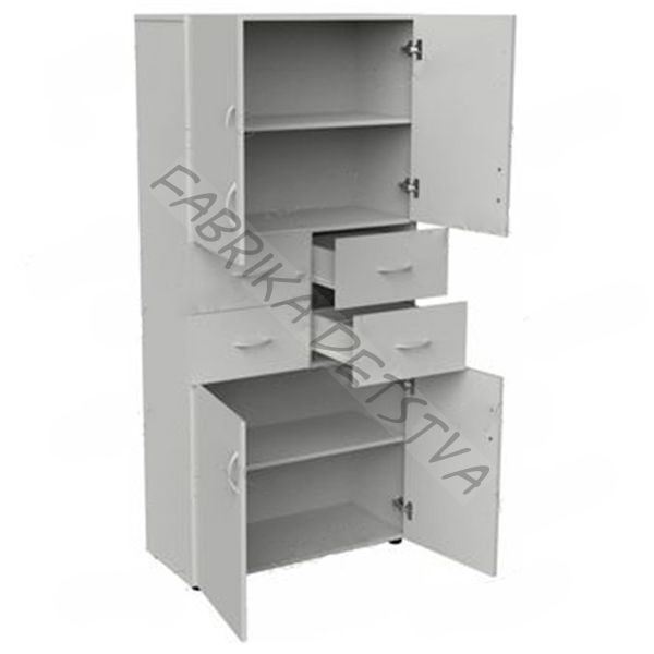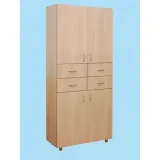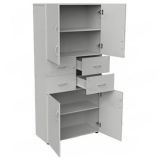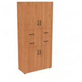 Шкаф изготовлен из ЛДСП толщиной 16 мм, отделан кантом ПВХ 0,4 мм. Внешний габарит 854х375х1820 мм. Задняя стенка изготовлена из ламинированного МДФ, толщиной 3,2 мм, в цвет ДСП из двух частей, которые соединяются между собой с помощью специального армированного скотча. Четыре двери попарно закрывают нижний и верхний отсеки. Между отсеками образуется ниша высотой 43 см, в которой устанавливаются четыре выкатных, на роликовых направляющих ящика. Комплектуется четырьмя полками: две врезных и две вкладных. Регулируемые опоры компенсируют неровности пола.