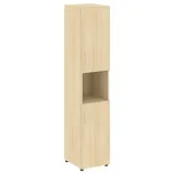Шкаф изготовлен из ЛДСП толщиной 16 мм, отделан кантом ПВХ 0,4 мм. Внешний габарит 429х375х1820 мм. Задняя стенка изготовлена из ламинированного МДФ, толщиной 3,2 мм, в цвет ДСП и крепится гвоздями. Две двери закрывают нижний и верхний отсеки. Между отсеками образуется ниша высотой 43 см. Крепление петель дверей позволяет устанавливать их как на правую, так и на левую сторону. Комплектуется четырьмя полками: две врезных и две вкладных. Регулируемые опоры компенсируют неровности пола.