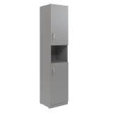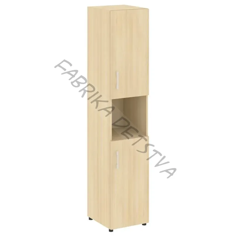 Шкаф изготовлен из ЛДСП толщиной 16 мм, отделан кантом ПВХ 0,4 мм. Внешний габарит 429х375х1820 мм. Задняя стенка изготовлена из ламинированного МДФ, толщиной 3,2 мм, в цвет ДСП и крепится гвоздями. Две двери закрывают нижний и верхний отсеки. Между отсеками образуется ниша высотой 43 см. Крепление петель дверей позволяет устанавливать их как на правую, так и на левую сторону. Комплектуется четырьмя полками: две врезных и две вкладных. Регулируемые опоры компенсируют неровности пола.