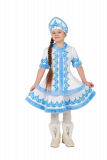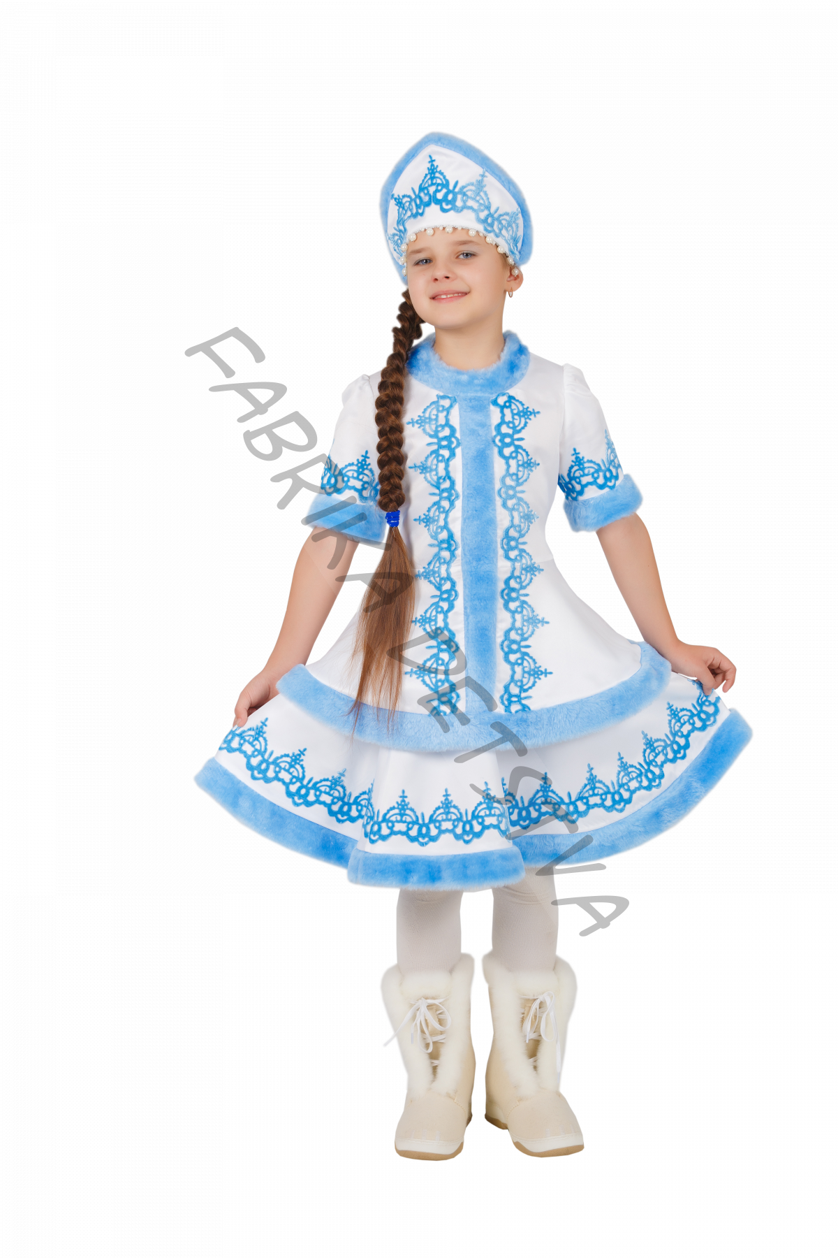 Маскарадный, сценический костюм "Снегурочка "Снежка" подойдет для театральных и тематических постановок, Новогодних праздников. Шубка приталенная имеет декоративные нашивки, рукав короткий, по краю изделия и низу рукавов пришит мех, шубка и юбка расшита кружевом. Кокошник выполнен из того же материала что и само изделие, также имеет декоративную нашивку и кружево. Держится кокошник на голове за счёт резинки.