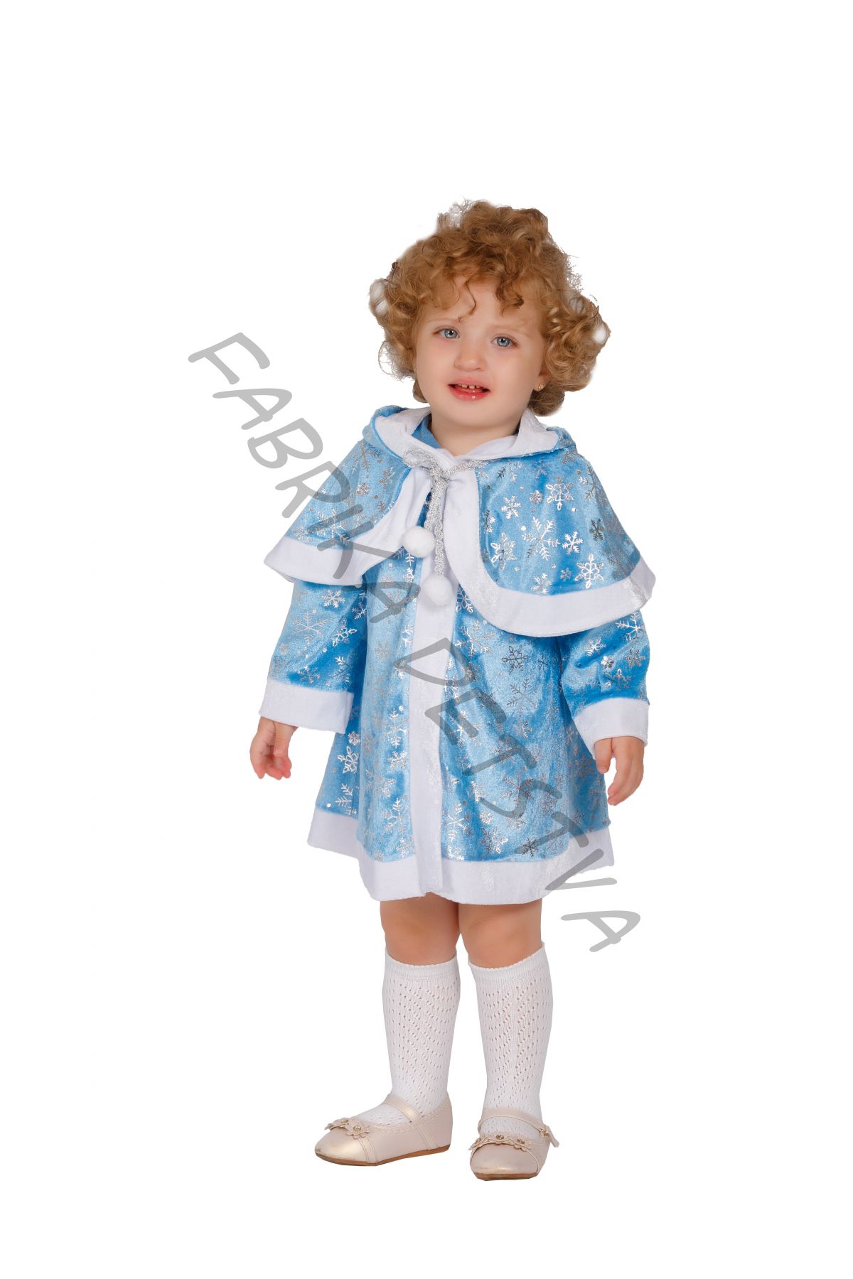 Карнавальный костюм "Снегурочка-малышка", из качественного голубого велюра, украшенного россыпью серебристых снежинок. Прелестный наряд для малышей.