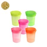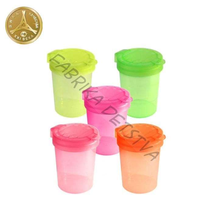Стакан–непроливайка предназначен для занятий рисованием. Завинчивающаяся крышка препятствует попаданию воды на рабочую поверхность. На крышке расположены 5 продольных желобков для кисточек. Метка безопасного уровня воды указывает на допустимое количество воды в стакане. Полный объем – 280 мл, до уровня метки – 80 мл