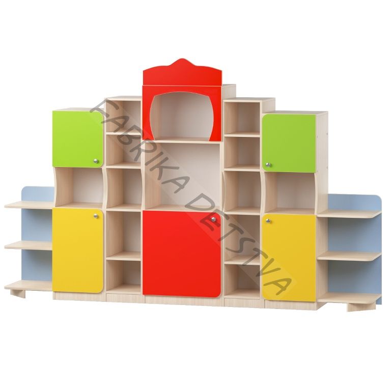 Стенка для детских пособий и игрушек оформлена в стиле горка . Рельефные украшения, ниши, полочки придают ей привлекательность и красоту. Материал исполнения: ламинированная ДСП толщиной 16 мм, цвет корпуса дуб молочный кромка ПВХ 2мм . Цветовое разрешение возможно по желанию заказчика. Стенка функционально используется для хранения игрушек и пособий в дошкольных учреждениях.
