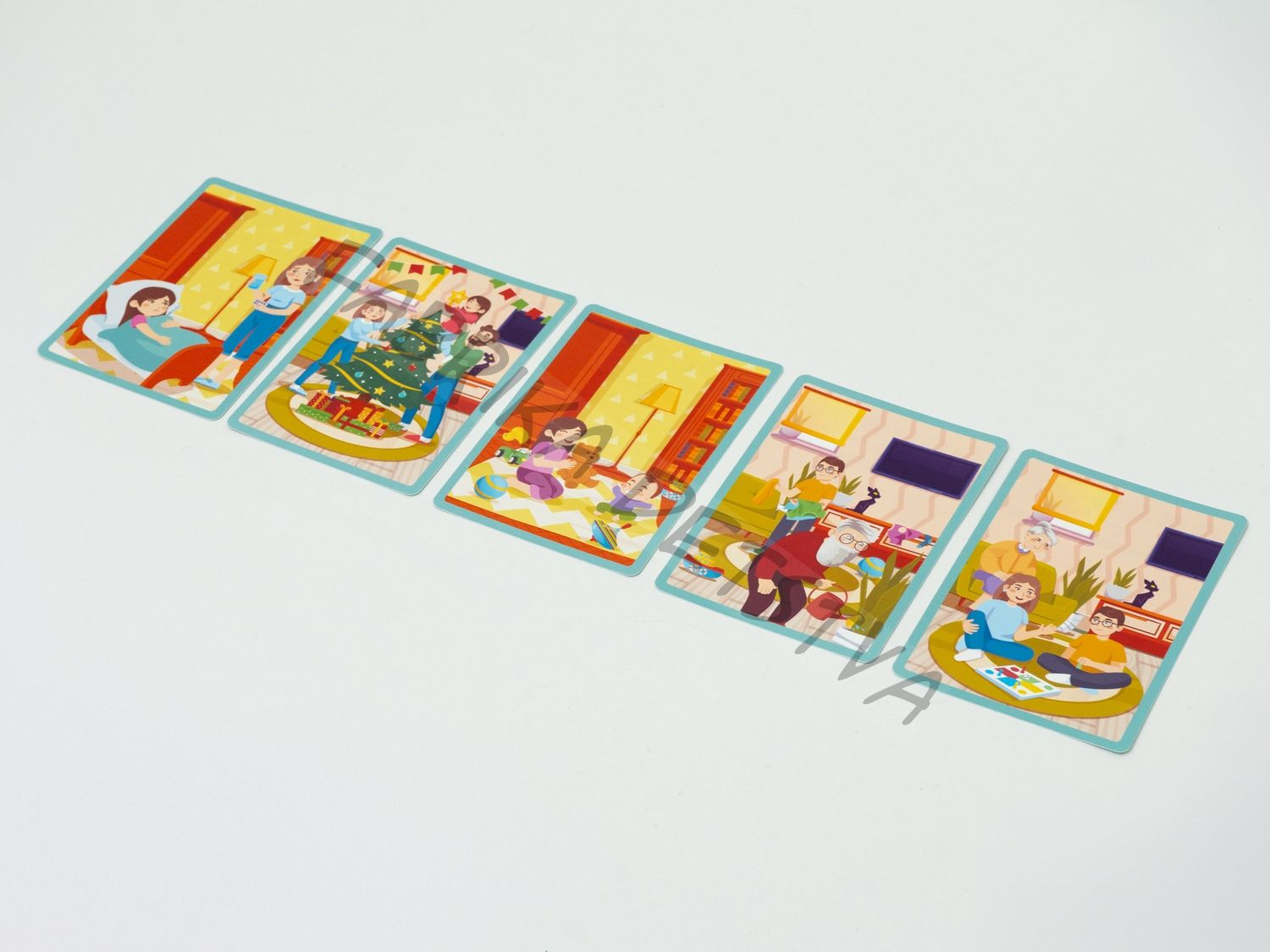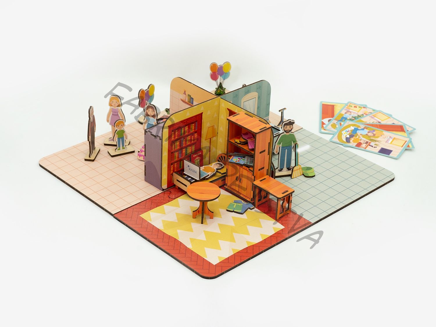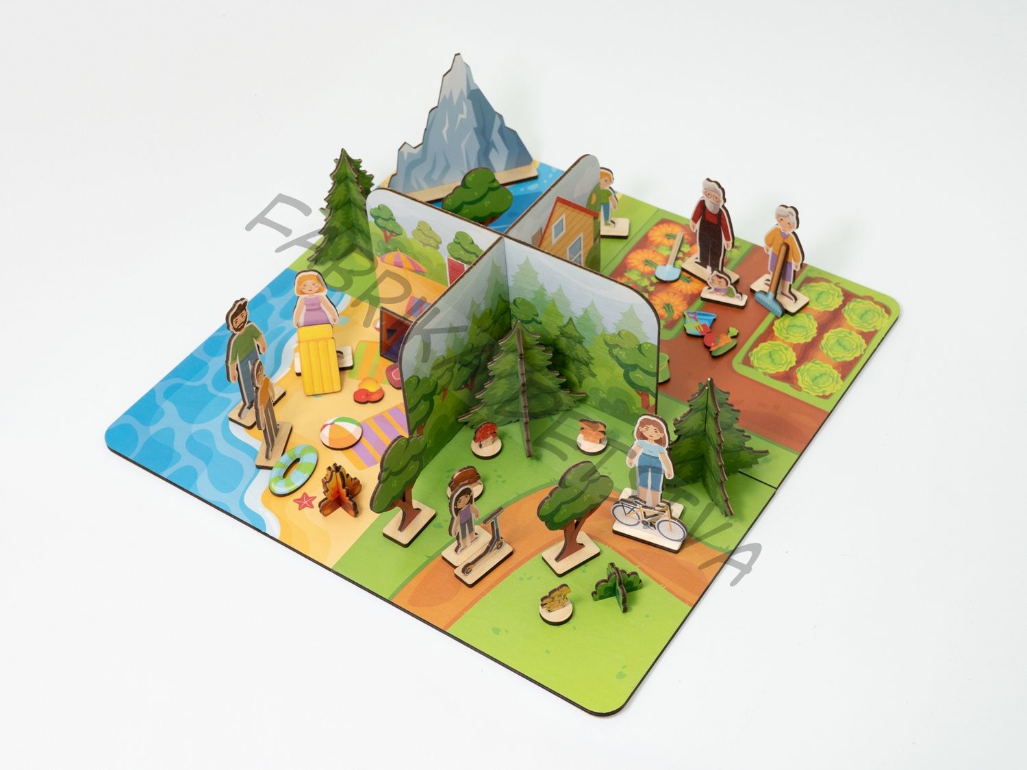 - Набор персонажей для игры: 7 членов семьи (папа, мама, 3 детей разного возраста и пола, дедушка, бабушка) и 5 дополнительных персонажей (полицейский, тренер, продавец, женщина, мальчик – комплектация зависит от типа локации).