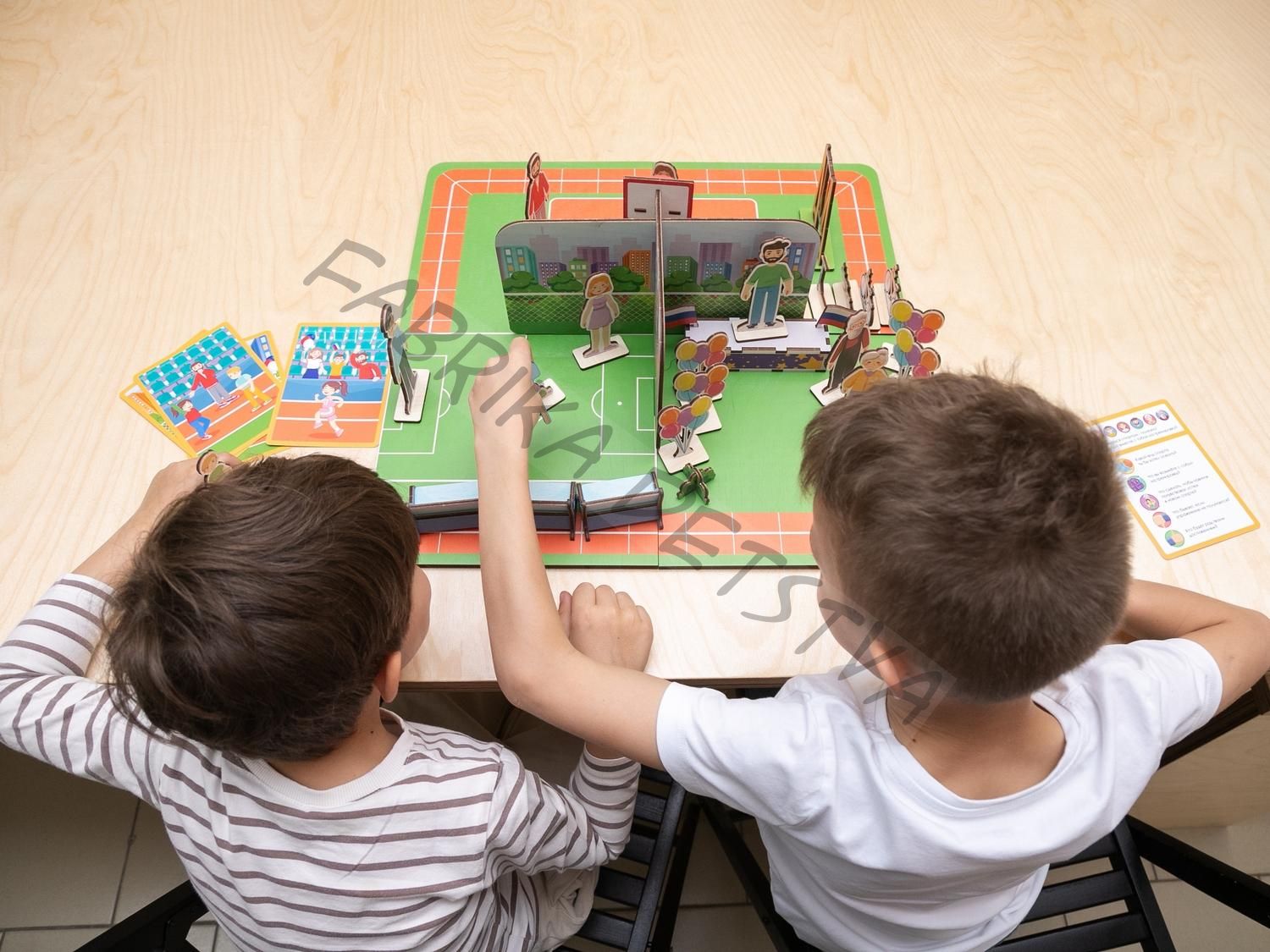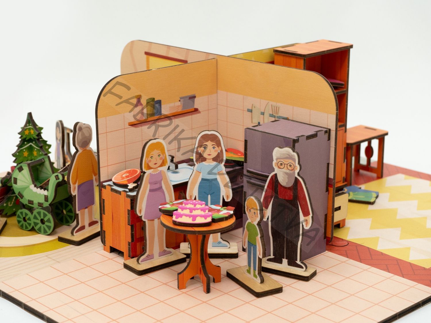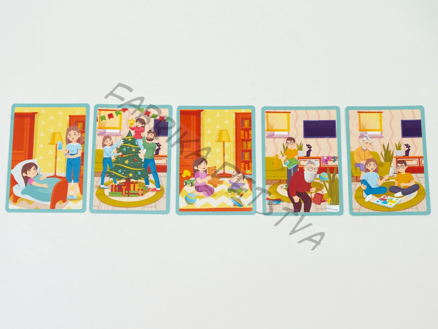 - Набор персонажей для игры: 7 членов семьи (папа, мама, 3 детей разного возраста и пола, дедушка, бабушка) и 5 дополнительных персонажей (полицейский, тренер, продавец, женщина, мальчик – комплектация зависит от типа локации).