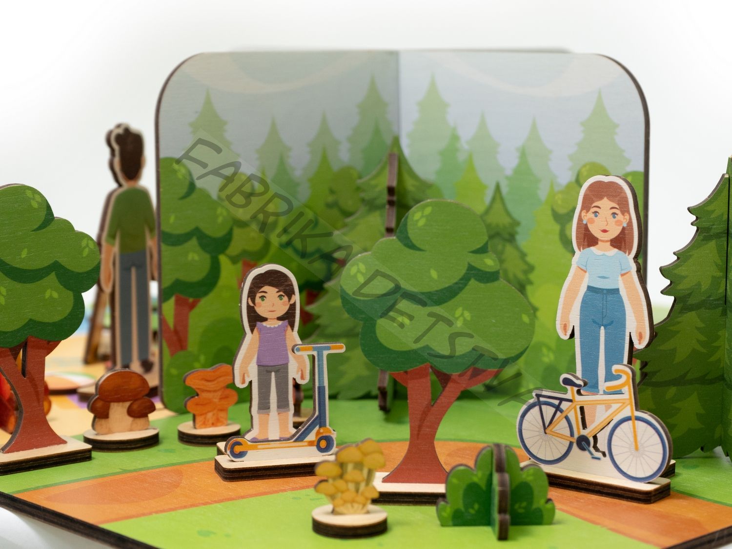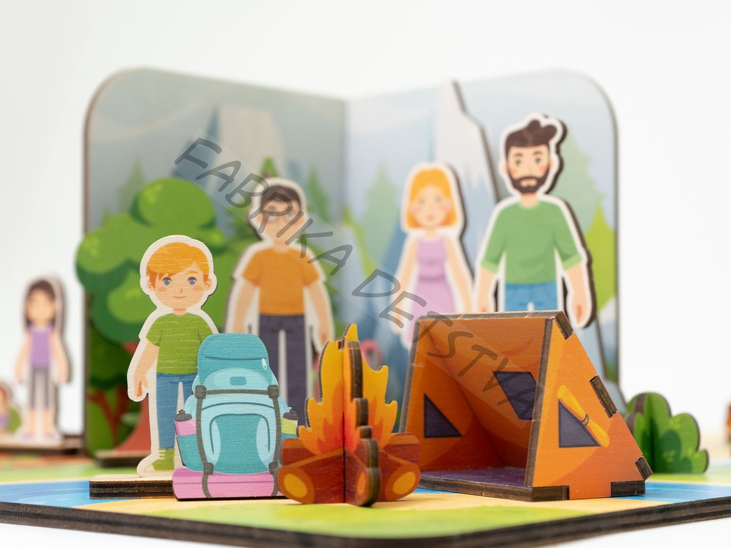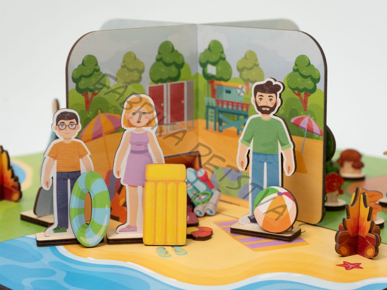 - Путешествие. Локация предлагает площадки для разыгрывания сюжетов семейного досуга в формате путешествий по России (поездка в горы, на пляж/водоем, в лес, на дачу).