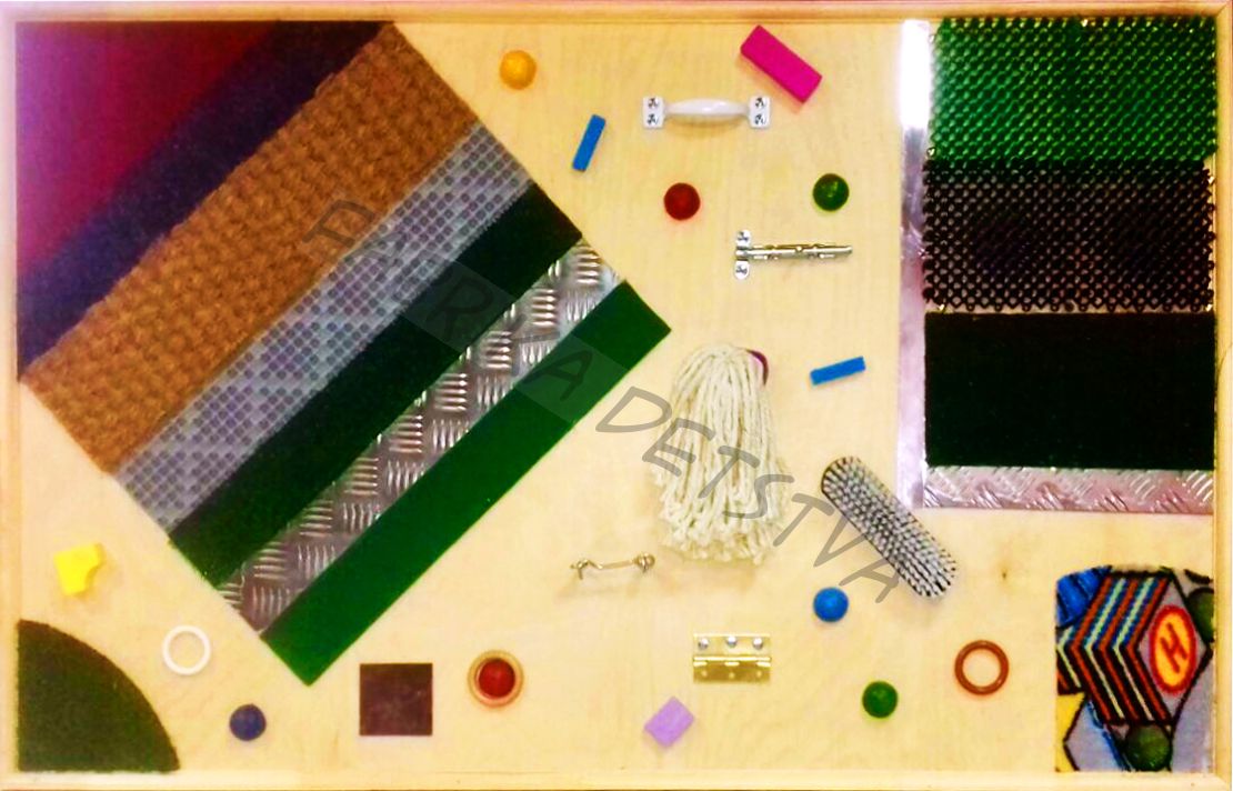 В панели размещены материалы с различными тактильными поверхностями, различные предметы, способствующие развитию тактильных ощущений, а так же – элементы игрушек. Панель развивает осязательные навыки, показана для детей с ослабленным зрением.