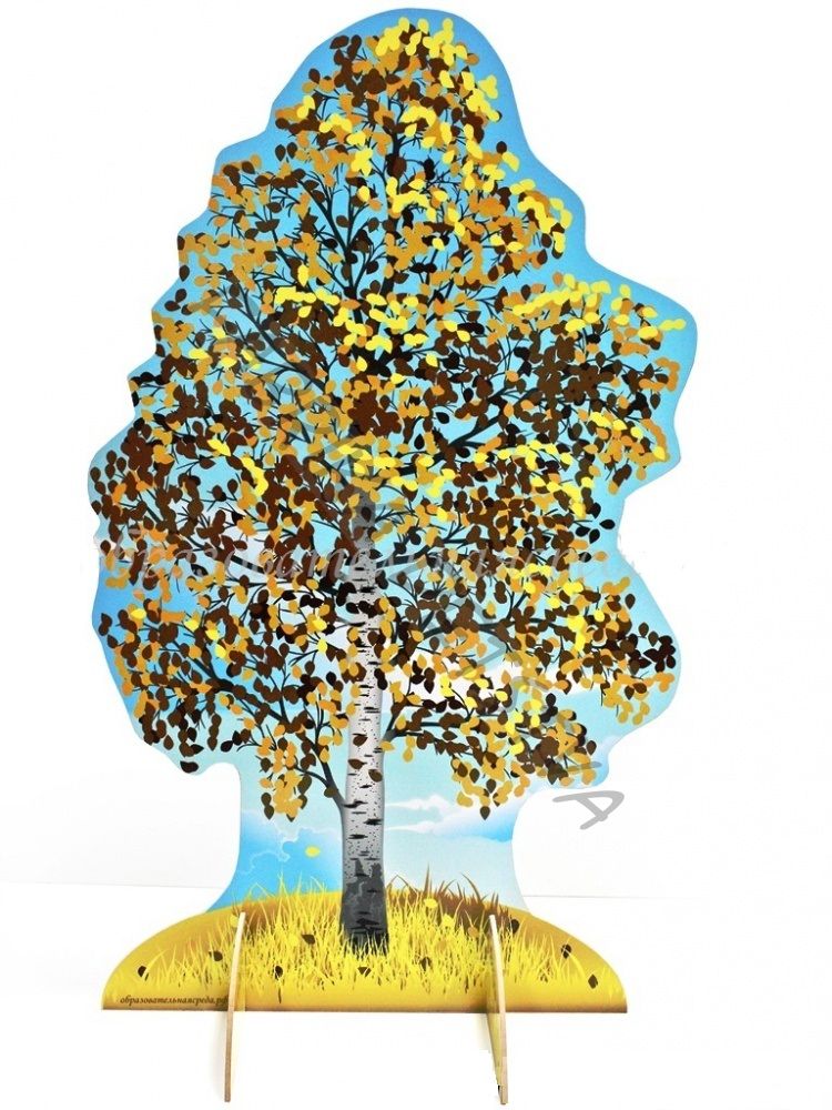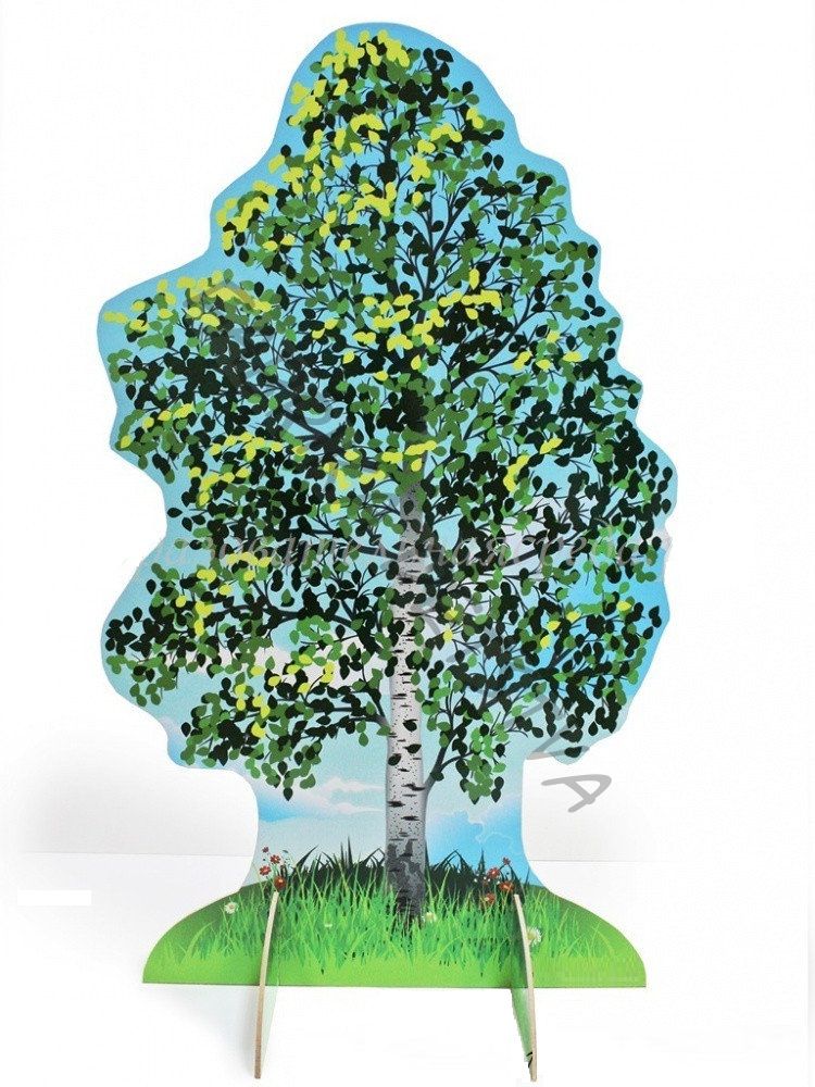 Театральная декорация "Береза" (лето-осень) выполнена из МДФ, с нанесением полноцветного рисунка с двух сторон. Высота декорации 1,6м, ширина - 1м.