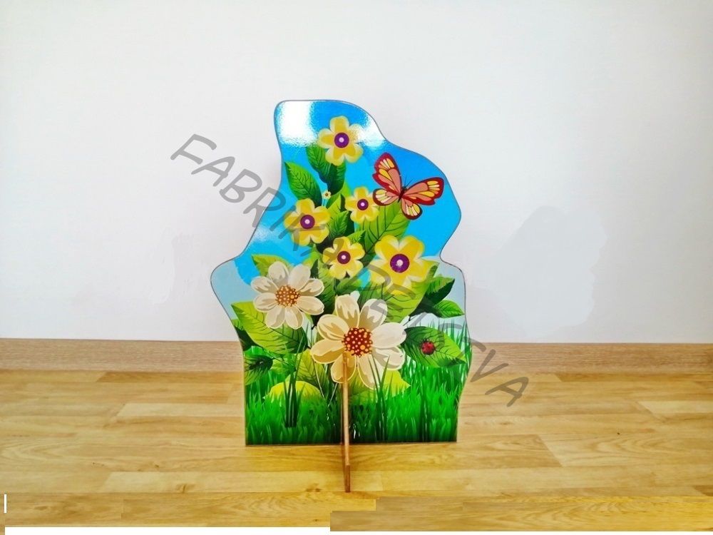 Театральная декорация "Колокольчики-подснежники" выполнена из МДФ, с нанесением полноцветного рисунка с двух сторон. Высота декорации 0,65м, ширина - 0,6м.