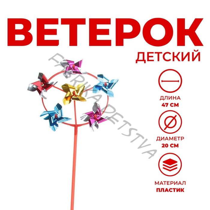 Ветряные мельницы закружат вас в вихре эмоций! Ветерок шестерка «Круг», цвета МИКС — это добродушная универсальная воздушная игрушка. Такая мельница поможет приучить малыша к прогулкам на свежем воздухе. С ней кроха изучит силу ветра и узнает, в какую сторону он дует. Оригинальные изображения и завораживающие движения игрушки не оставят равнодушным вашего ребёнка. Этот аксессуар подойдёт для празднования любого торжества в качестве украшения, а также как дополнение к подарку или цветочной композиции. Ветерок поможет и в дачных делах: он украсит садовый участок и защитит, как настоящий оберег хорошего урожая и атрибут отличного настроения