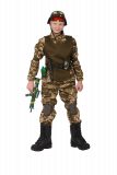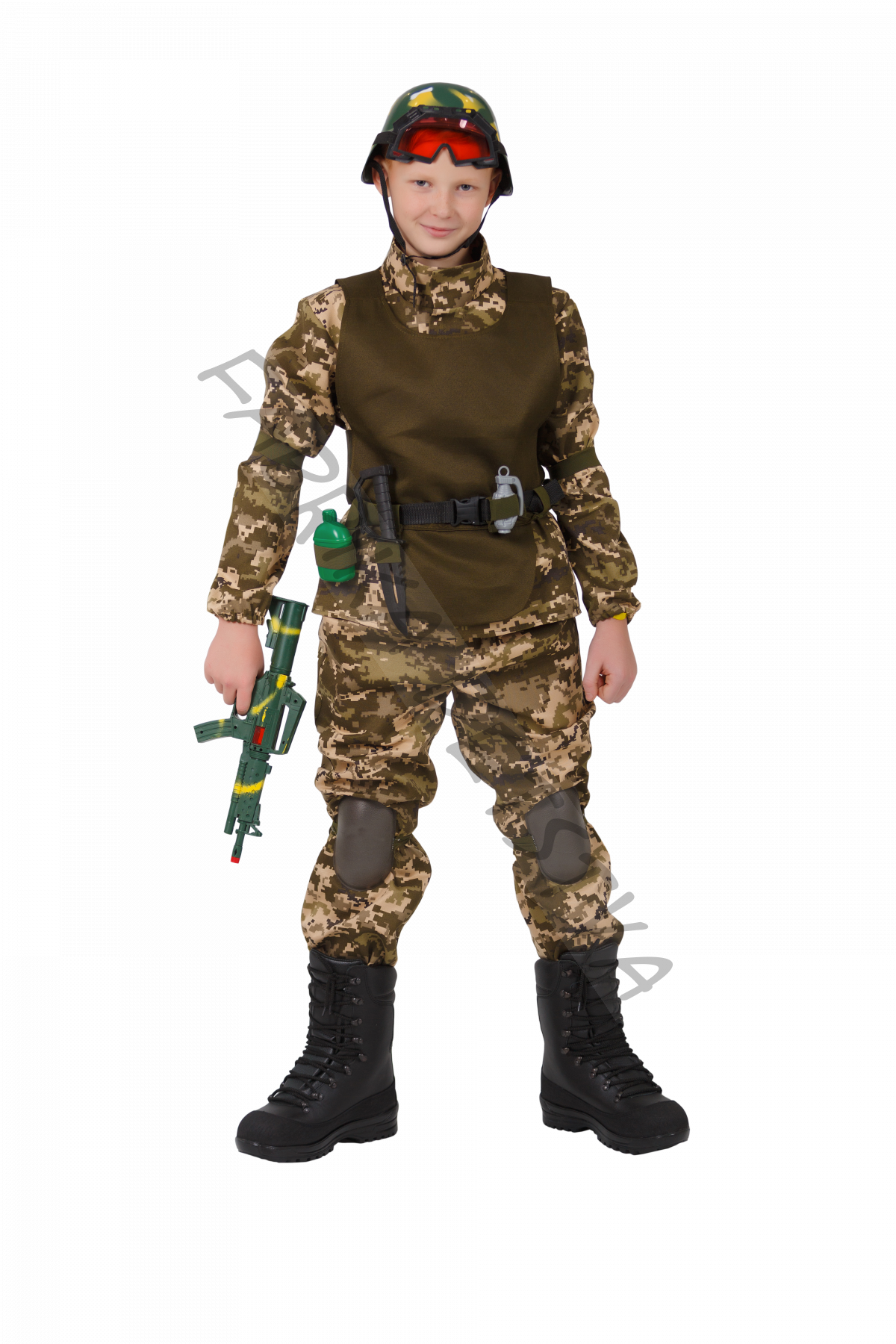 Военный костюм Спецназ выполнен из камуфляжной ткани. Куртка прямого силуэта, застёгивается впереди на липучку. Рукав втачной длинный, низ собран на резинку. Воротник-стойка. Брюки свободные, прямые. Жилет сзади застёгивается на липучки. Костюм не сковывает движения. Для защиты колен и локтей используются наколенники и налокотники. Граната, нож, рация, фляжка и автомат, позволят полностью погрузиться в роль спецназа. Свободная форма одежды не сковывает движения. Прекрасно подойдёт для военно-патриотических праздников, 23-го февраля, 9-го мая, сценических и театральных постановок.