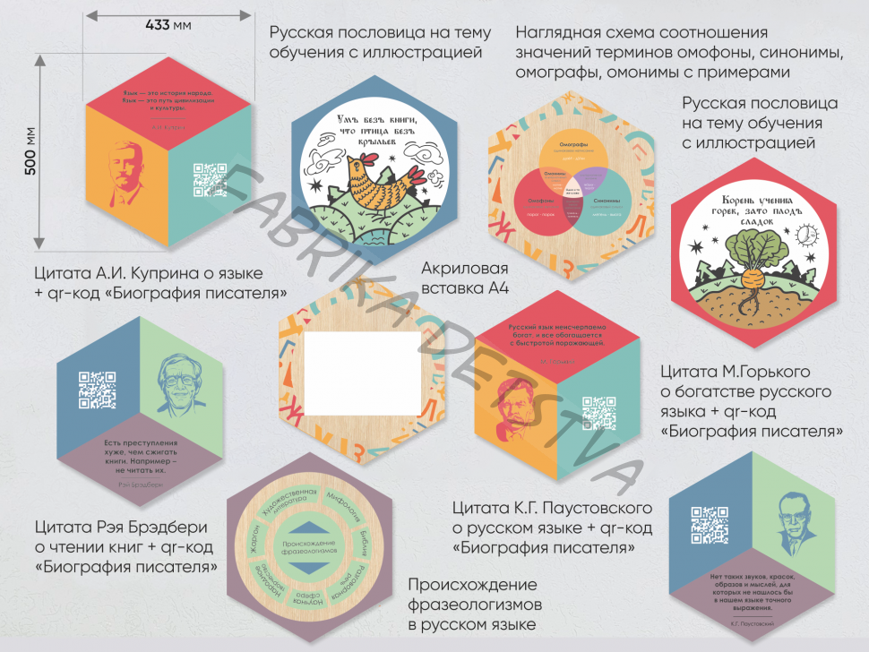 Каждый шестигранник содержит обучающую информацию: портреты выдающихся людей, их достижения и великие цитаты, основные постулаты науки, формулы, графики, теоремы. Благодаря qr-кодам дети могут подробнее узнать об учёных, изображённых на портретах, стоит только навести на них телефон.